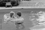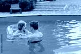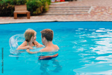 Dad and daughter have fun and swim with inflatable circle in the pool.