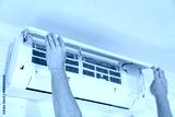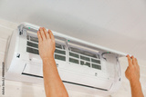 A man replaces and cleans the air cleaner filter from the air conditioner.