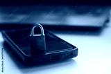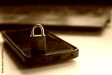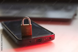 Closeup of closed metal padlock on modern smartphone, personal data protection Security concept