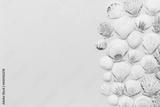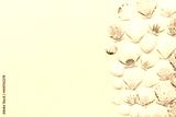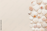 Minimal seashells frame with copy space on neutral beige background. Seashell summer background
