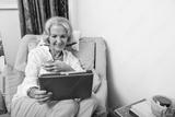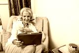 Happy senior woman looking at digital tablet on armchair in house
