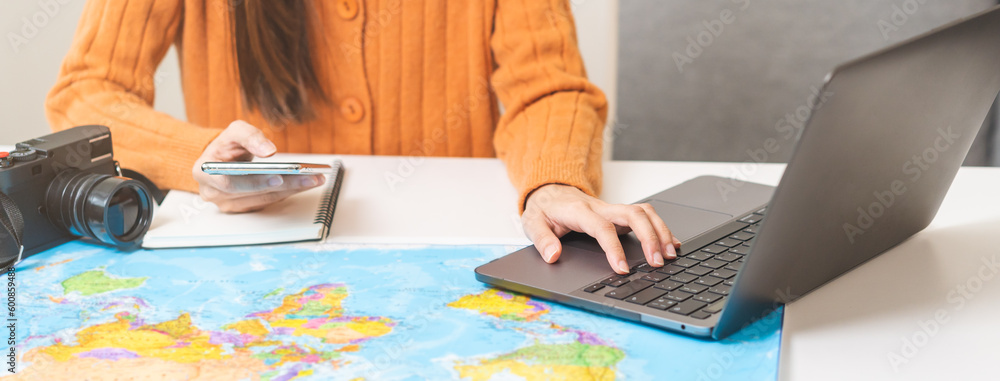 Travel planning, vacation, holiday trip concept, asian young tourist woman hand take note, check list using laptop searching information booking ticket or hotel online, preparation for journey trip.