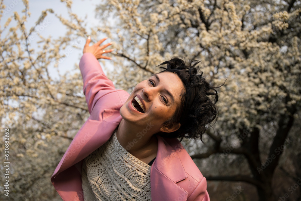 Young woman wearing stylish outfit near blossoming sakura in park. Fashionable spring look
