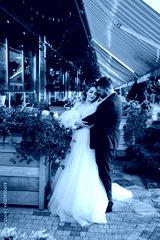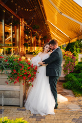 the bride and groom embrace on the terrace in the park near the restaurant.