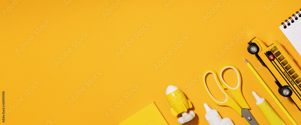 Assorted office and school white and yellow stationery. copy space for back to school or education craft office work concept. Bright Yellow monochrome school bus, rocket. Achievement and success.