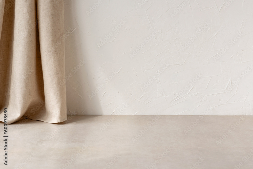 Neutral empty room background, white plaster wall, beige stone floor or tabletop, linen curtain, elegant home interior design template, sustainable Scandinavian style, copy space