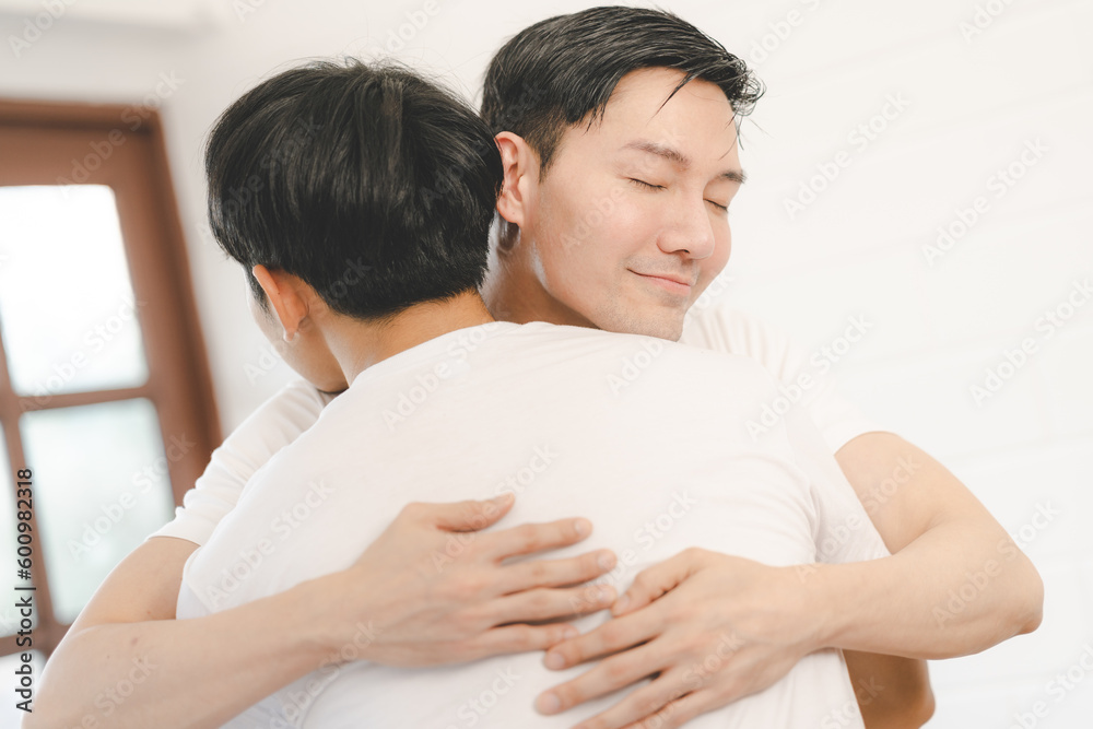 Happy Asian gay couple hug together on sofa. Asian LGBT couple embracing together at home. Diversity of LGBT relationships. A gay couple concept. LGBT multi relationship.