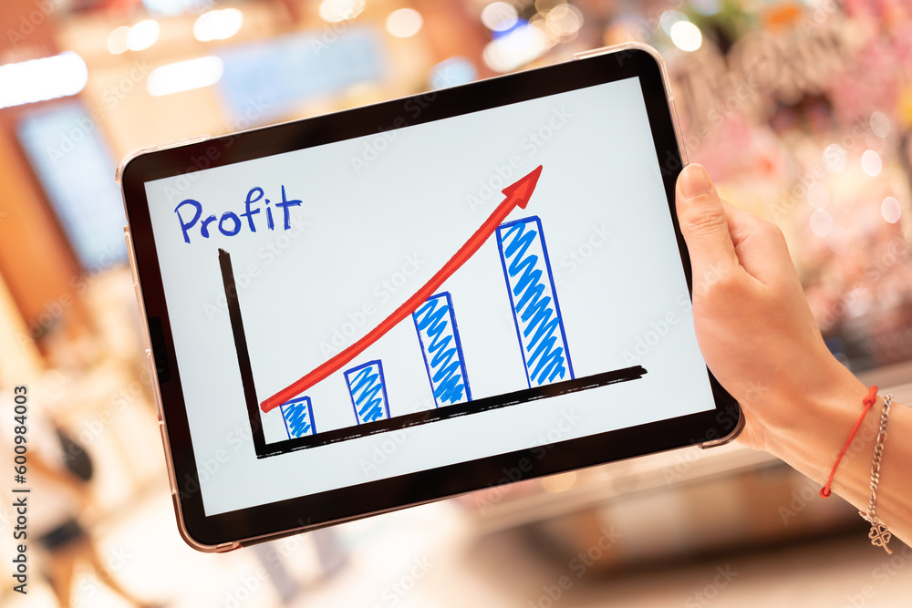 Business growth predication graph in Tablet with blur background of department store. Business successful concept. Concept of growth planning and strategy.