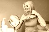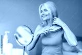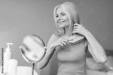 Beautiful senior woman brushing her blonde hair with comb, sitting at dressing table and looking at mirror at home