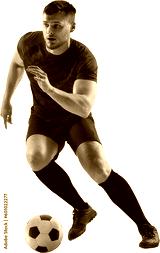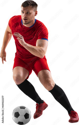 Young man in red uniform, professional football player in motion training, dribbling ball isolated over transparent background. Concept of sport, competition, action and motion, lifestyle