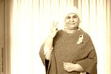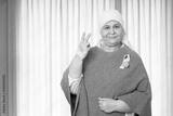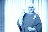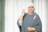 Portrait of indian senior woman cancer patient survivor standing with victory hand gesture at hospital after chemotherapy sessions , Healthcare Concept.