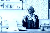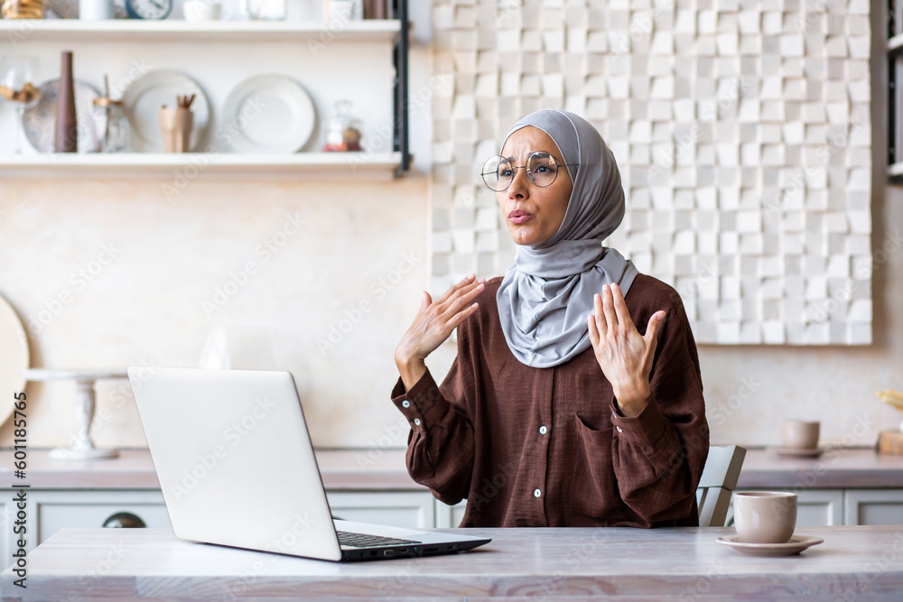 Very hot at home. broken air conditioner. Young woman in hijab sitting at home in front of laptop and waving hands at face, making fresh cool air, suffering from heat, breathing hard, panic attack.