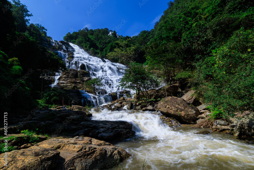 wide angle shot, Mea Ya Waterfall in the rain season at Doi Inthanon National park, north of Chiang Mai Province, Thailand
