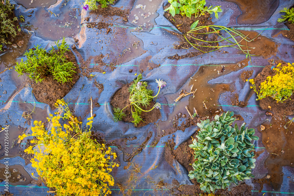 Installing weed control fabric material and bark mulch in a residential garden to control weed spreading