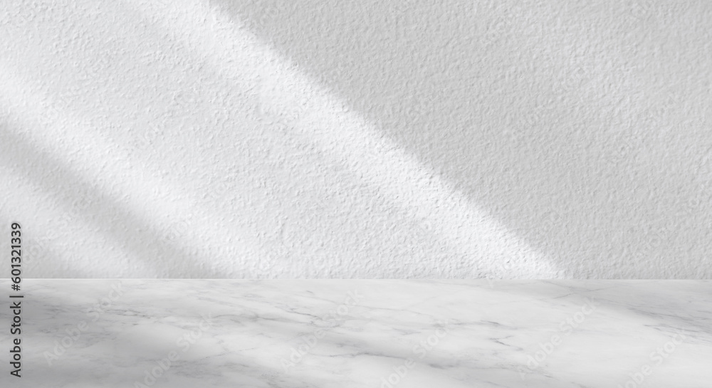 Studio background Concrete wall texture with Natural light shadow overlay on Marble Floor. Empty Room White Cement with sunbeam from window,Backdrop Display for Product Presentation,Promotion