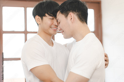 Happy Asian gay couple hug together on sofa. Asian LGBT couple embracing together at home. Diversity of LGBT relationships. A gay couple concept. LGBT multi relationship.
