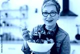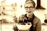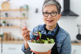 Happy mature woman in glasses with a big plate of salad, portrait.