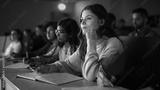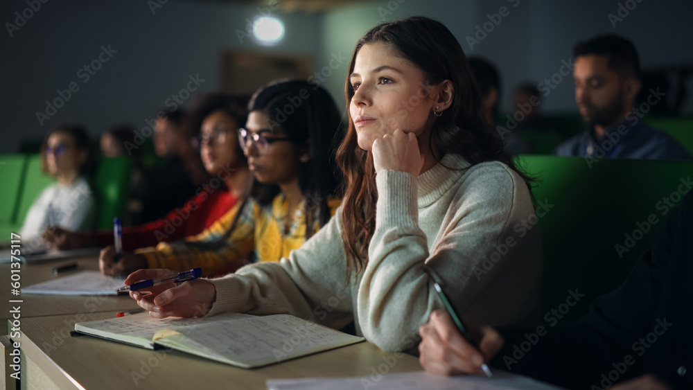 Talented Smart Female Student Studying in College with Diverse Multicultural Colleagues. She is Writing Down a Summary from the Lecture in Her Notebook