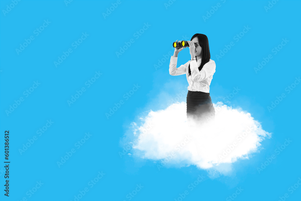 Businesswoman standing on cloud looking through binoculars