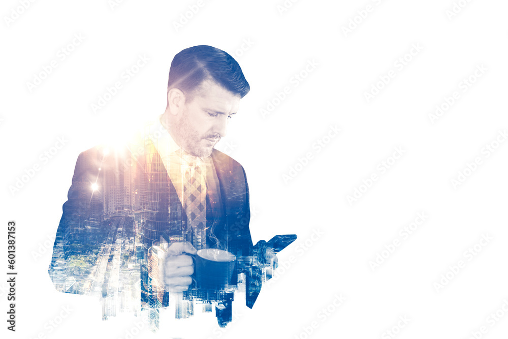 The double exposure image of the business man standing holding a mobile phone
