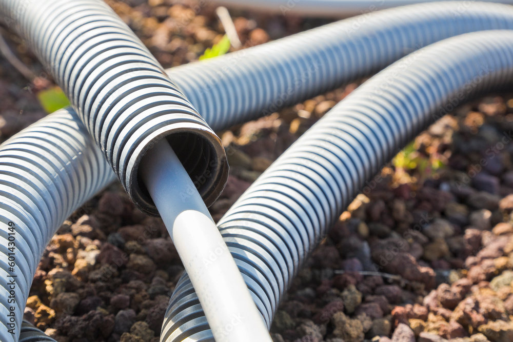 Flexible plastic pipeline with electric cable coming out from th