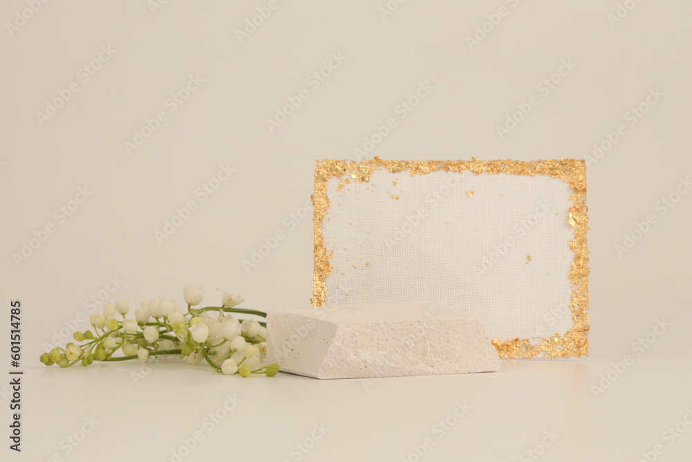 Stone platform podium and empty paper gold frame card background. Minimal empty display product presentation scene.