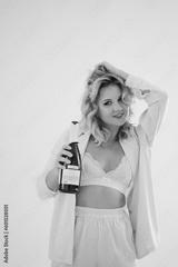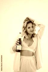 blonde woman in delicate pajamas in bed with a bottle of champagne