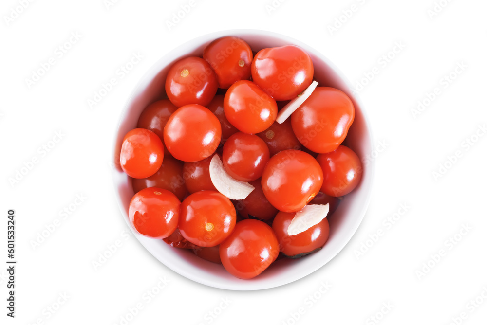 Pickled tomatoes in a bowl with garlic on a white isolated background