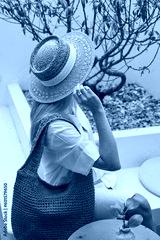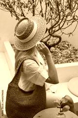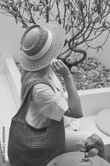 Fashion woman in straw hat with straw bag sitting in modern interior cafe with cup of coffee.