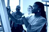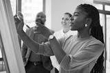Black woman, business learning and whiteboard writing for company planning with strategy. African female employee, meeting and sales collaboration of staff working with teamwork and workshop idea