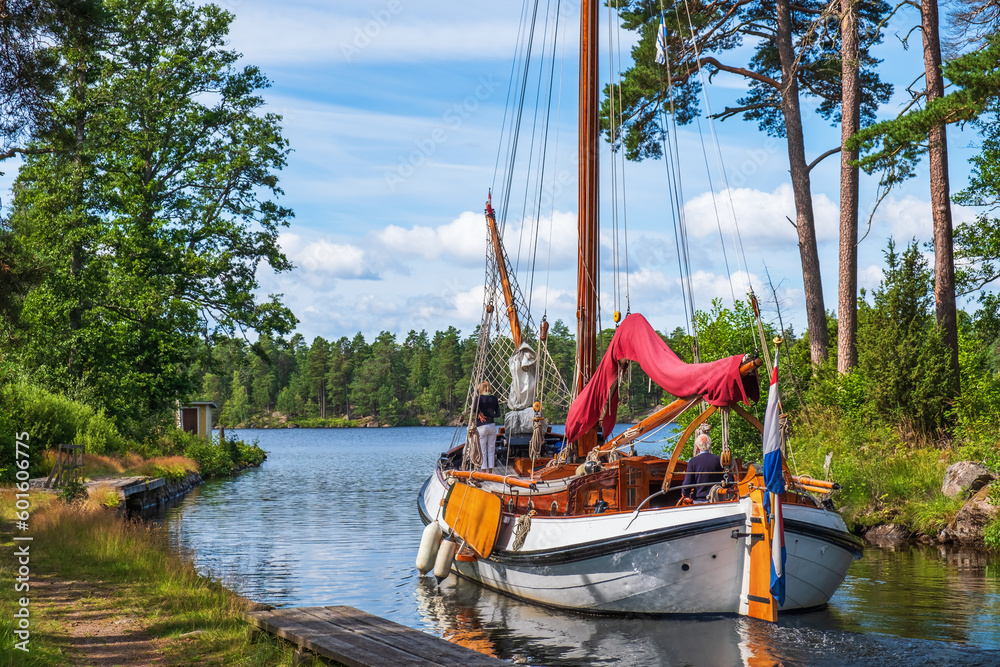 Old beautiful sailboat on an idyllic Göta canal on a sunny summer day