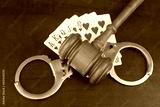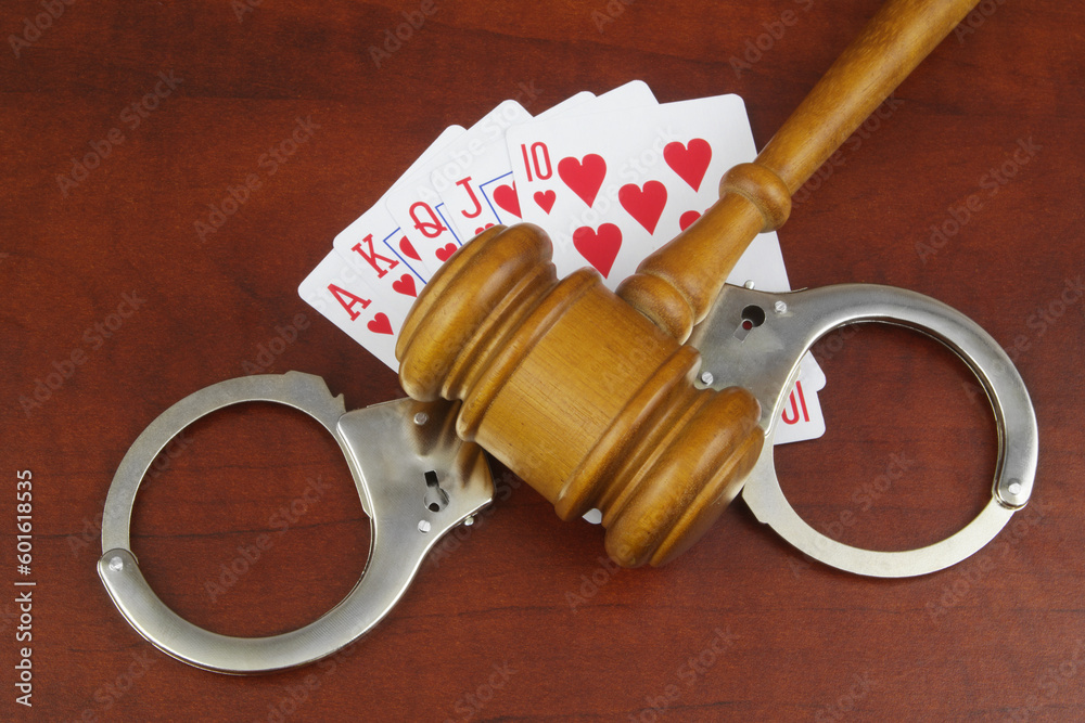 Five hearts playing cards, handcuffs and judge gavel on wooden table. Court and gambling concept.