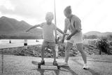 Mother teaching her daughter how to skateboard in the park. Child riding skate board. Healthy sports and outdoor activities for school children in the summer.