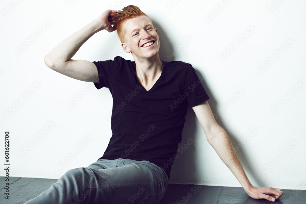Portrait, ginger and man sitting on a floor with hand on head or relax or smile for fashion and against white wall. Happy, unique style and excited male model with red hair laugh for fun in studio