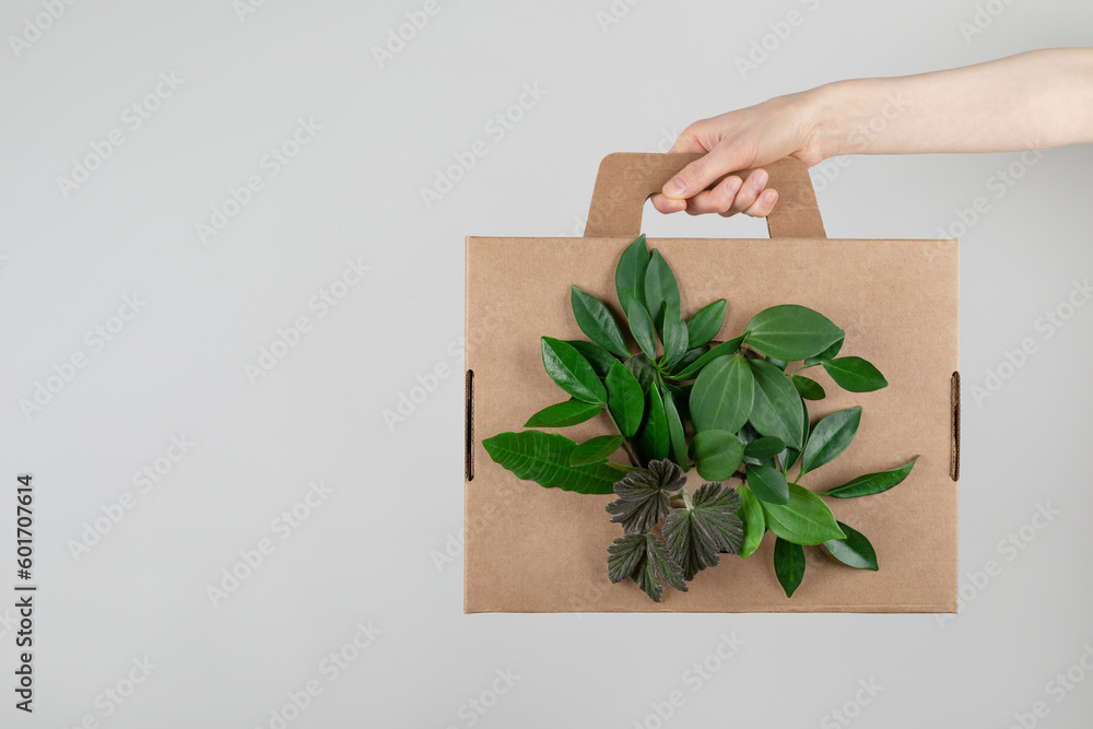 Woman hand holding cardbox from natural recyclable materials with green leaves sprouts. Responsible consumption, eco friendly packaging, zero waste concept..