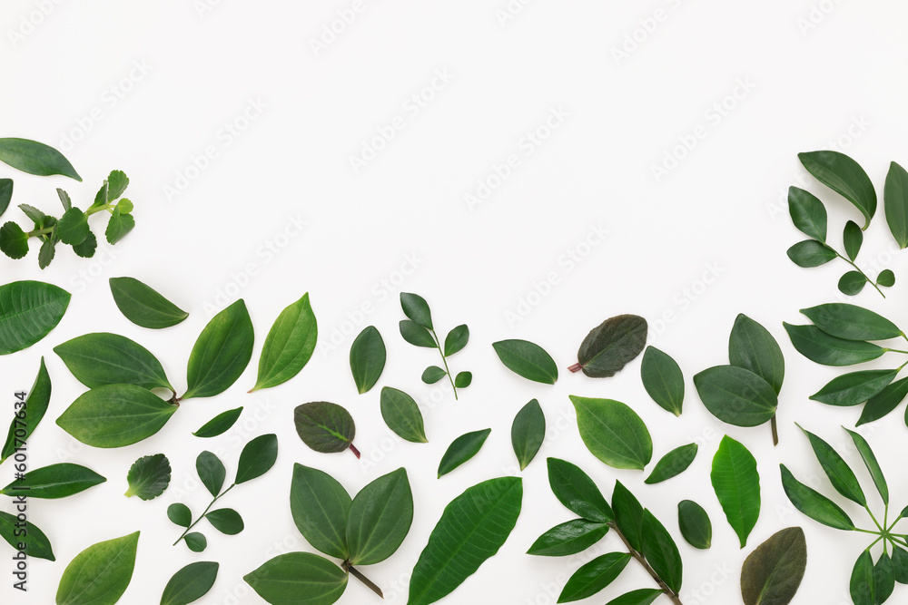 Creative layout made of green leaves from houseplants top view. Abstarct pattern with copy space for design..