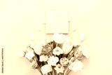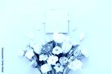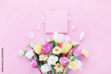 Bouquet of beautiful spring flowers, hearts and greeting card or paper blank on pastel pink table for holidays and congratulations.