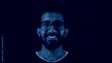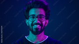 Portrait Indian man Muslim guy developer coding worker smile computer internet technology hacker Arabian male in glasses smiling neon blue ultraviolet studio background high-tech future cyberspace