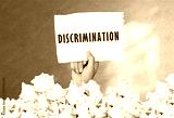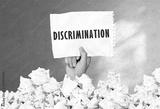 Hand holds a piece of paper with text Discrimination on a gray wall background