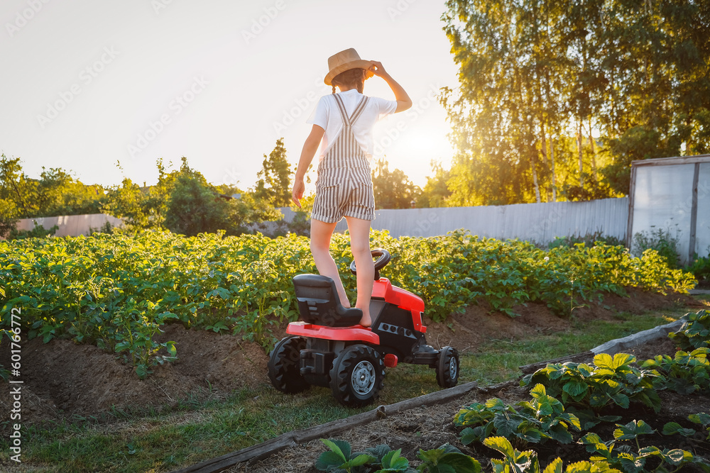 child girl admires the sunset standing on a pedal tractor in the backyard in the garden in the village.