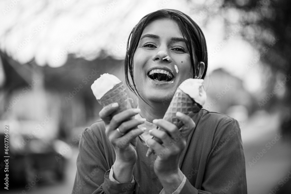 Holding ice cream, get her nose dirty in ice cream, smile.