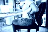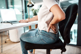 Back pain, stress and business woman at desk with burnout, muscle ache and tension in sitting posture. Health, medical emergency and female worker with spine problem, accident and injury in office