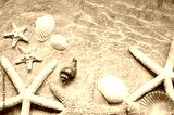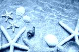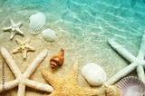 Starfish and seashell on the summer beach in sea water. Summer background. Summer time.