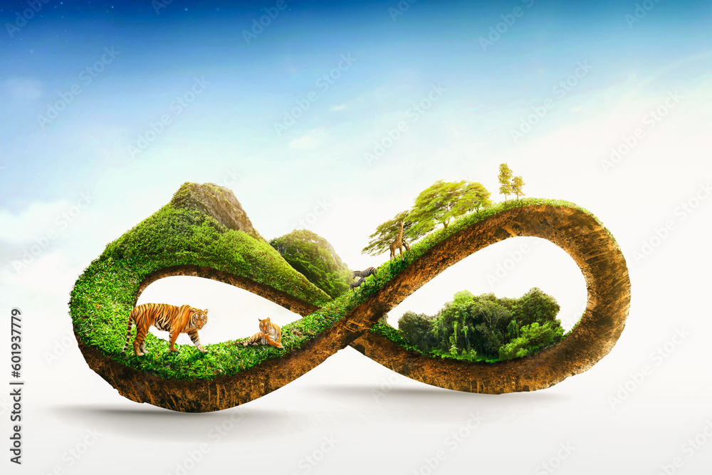 3d illustration of infinity environment concept. infinite earth land with green grass isolated on blue sky background. Eco and circular economy concept. wildlife protection, Wildlife Conservation Day.