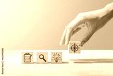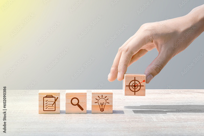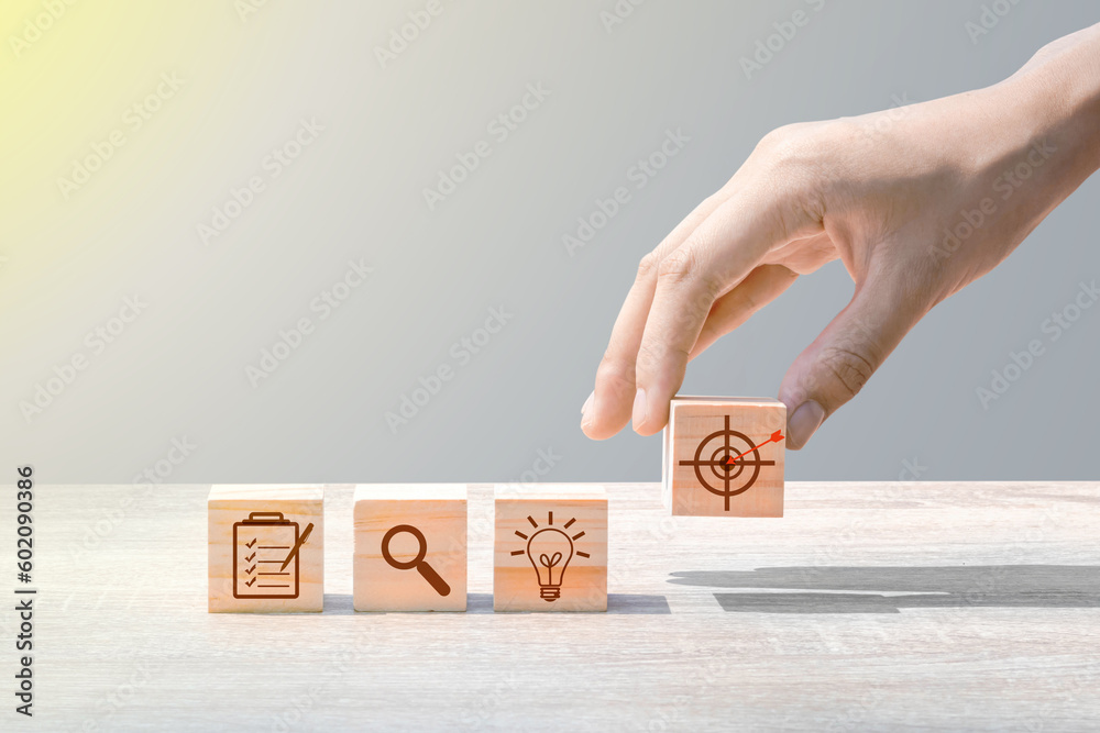 Hands putting wooden blocks with icons on wooden table. Business Strategy and Action Plan