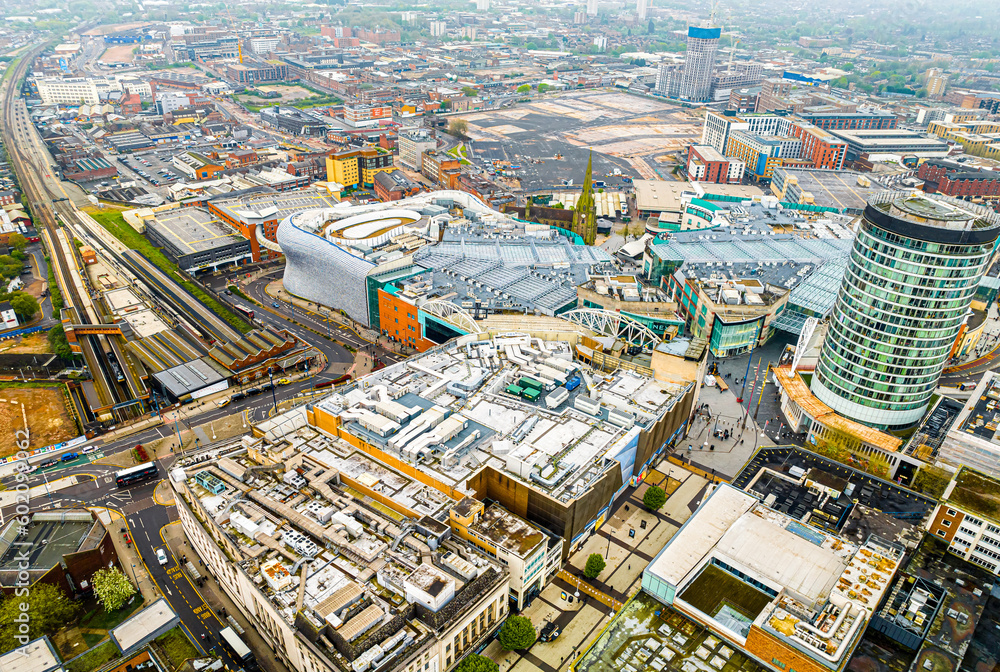 Aerial view of Birmingham, a major city in England’s West Midlands region, with multiple Industrial Revolution-era landmarks