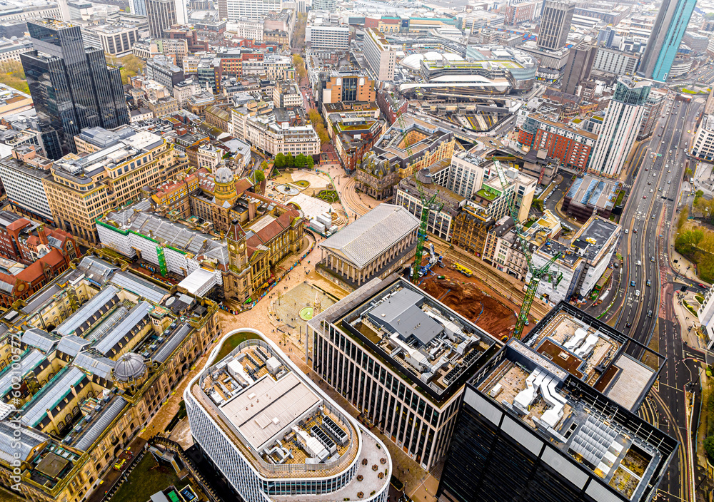 Aerial view of Birmingham, a major city in England’s West Midlands region, with multiple Industrial Revolution-era landmarks