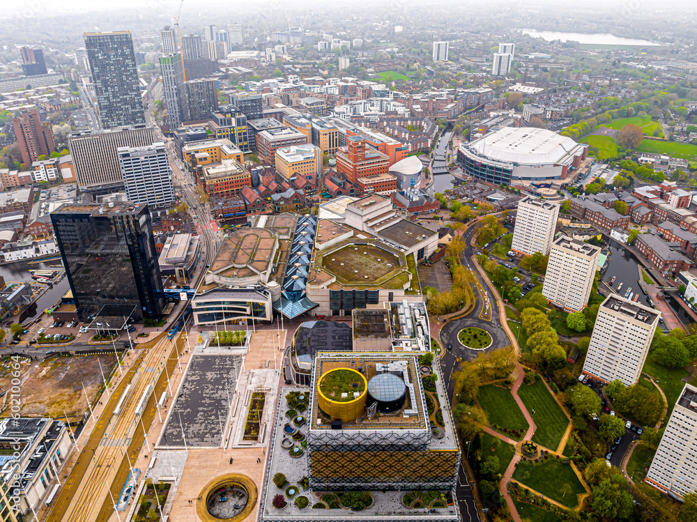 Aerial view of Birmingham, a major city in England’s West Midlands region, with multiple Industrial Revolution-era landmarks