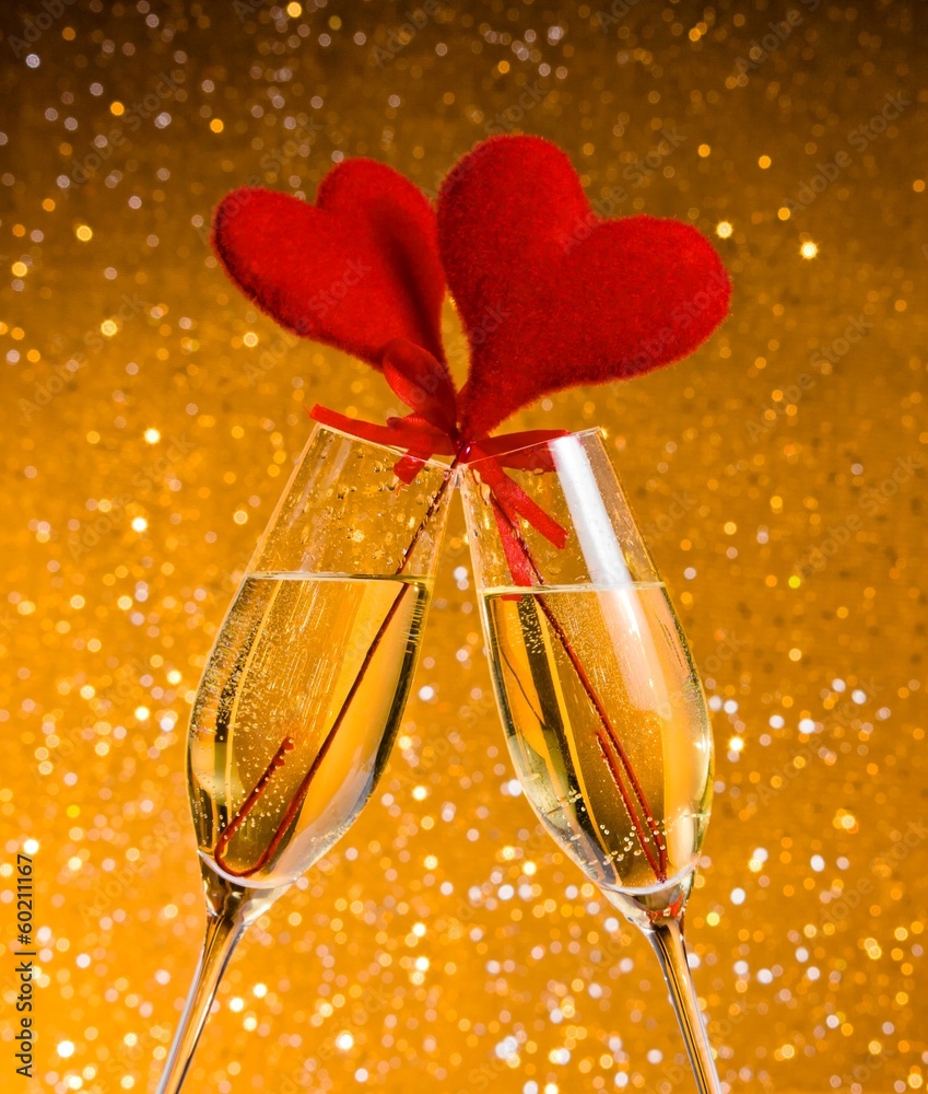 champagne flutes with red hearts make cheers on golden bokeh