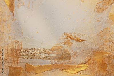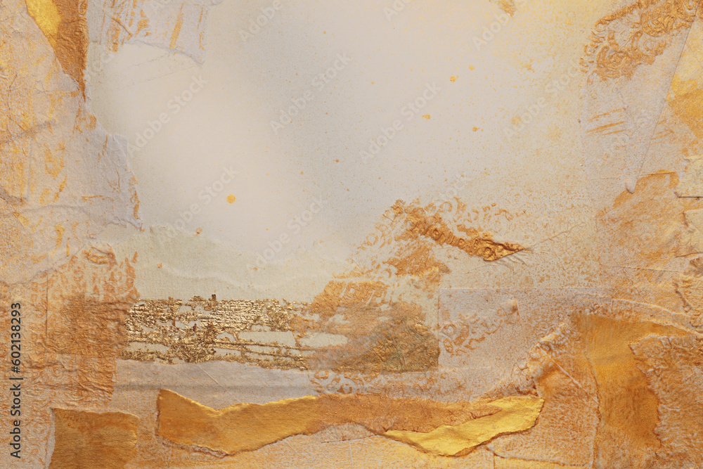 Gold and bronze glitter paper collage frame. Abstract glow texture copy space background.
